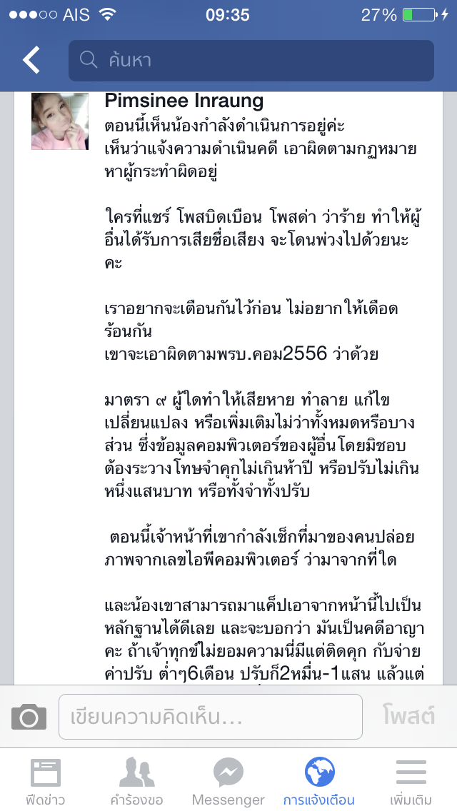 เราคิดว่า...บางทีเทคโนโลยีมันก็ เหมือนดาบสองคมนะ คนที่แชร์ก็ไม่เคยตรวจสอบก่อน คนที่โดนก็หนักเลย โดนด่าเละ แล้วถ้าเขาไม่ได้ทำหล่ะ. โดนด่าฟรีเหรอ เป็นเราจะแจ้งความดำเนอนคดีเอาผิดพรบ.คอมเลย โทษฐานทำให้ผู้อื่นเสื่อมเสียชื่อเสียง