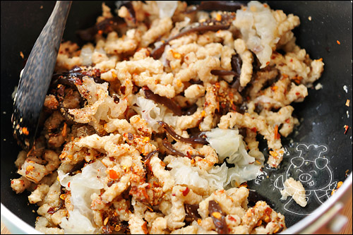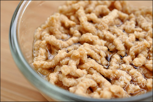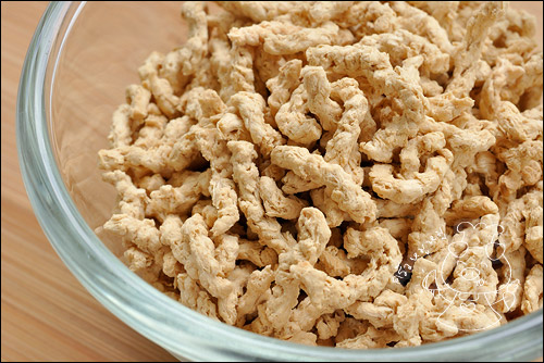 โปรตีนเกษตร นำมาแช่น้ำให้นิ่มค่ะ หรือใครจะใช้เต้าหู้แข็งก็ได้ค่ะ นำมาลวกหรือทอด แล้วเอามาขยำๆแบบหยาบๆ