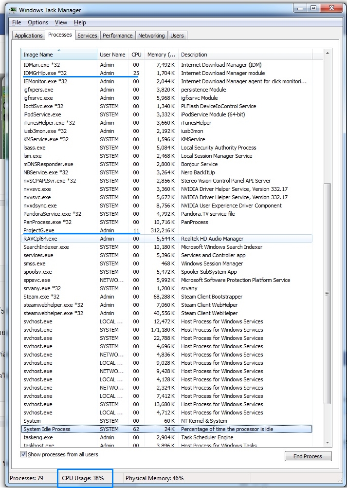 จากรูป จขกท.โปรแกรมที่ใช้งานอยู่ ตามเส้นสีฟ้าที่ขีดเส้นใต้รวมกันแล้วจะใกล้เคียง CPU Usage กรอบสี่เหลี่ยมสีฟ้า