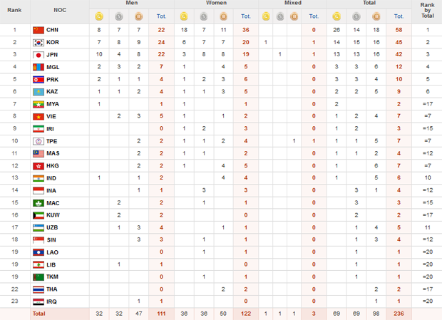 ส่วนไทยอยู่อันดับที่ 22 มี 2 เหรียญทองแดง จากยกน้ำหนักหญิง รุ่น 58 กก. และยูโด หญิงรุ่น 78 กก.