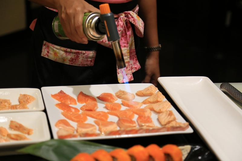ลูกมือเชฟกำลังลนไฟใส่ปลาแซลม่อนดิบ มันจะสุกข้างเดียวนะครับ อีกข้างไม่สุก