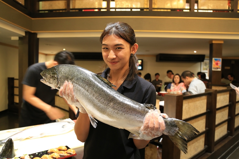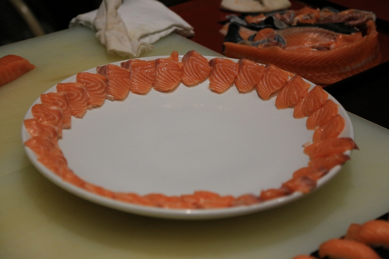 เชฟกำลังแล่ปลาแซลม่อน อย่างใจเย็นครับ