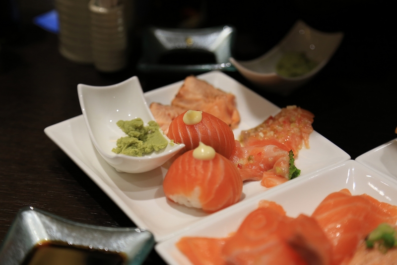 ซูชิปลาแซลม่อนดิบ จะคำใหญ่พอสมควรเนื้อปลาสดหวานมากครับ ข้าวร่วนไปหน่อยไม่ค่อยจับตัวเป็นก้อนนัก ส่วนปลาแซบม่อนลนไฟนั้นรสชาติกลมกล่อมดีครับ มีน้ำมันของปลาออกมาด้วยหวานๆ แต่วาซาบิของร้านนั้นไม่ค่อยออกรถฉุนเลย เหมือนถั่วบดซะมากกว่า โชยุก็เค็มไปนิดดับกลิ่นอาหารแทบหมด แนะนำให้จิ้มน้อยๆ ครับ