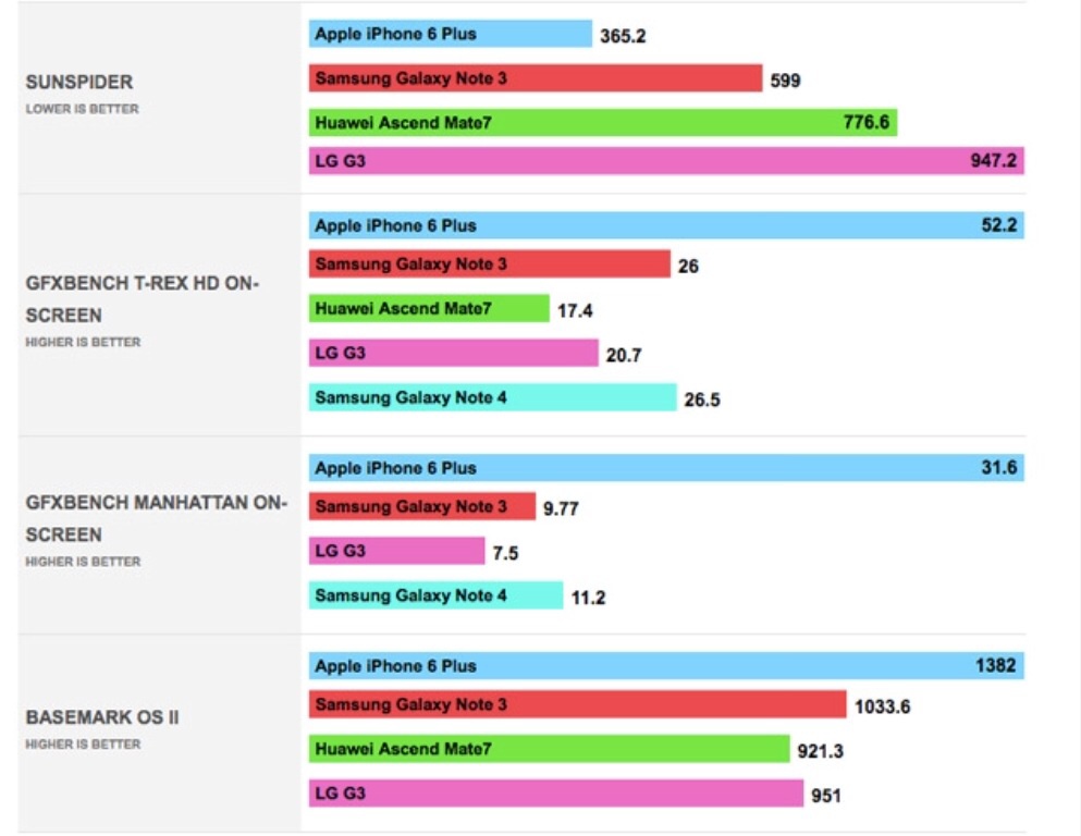 มาแล้วววผลทดสอบBenchmark Iphone 6 Plus เปรียบเทียบกับ Samsung Galaxy Note 4 LG G3 Note 3 ใครประสิทธิภาพเหนือกว่ากัน!