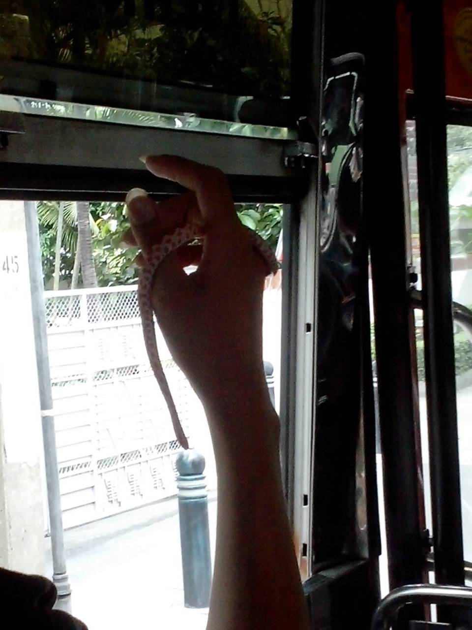 เมือวันเสาร์ เราได้นั่งรถเมลสาย 77 คนไม่เยอะเท่าไร เราขึ้นมาก็ได้นั่ง พอนั่งเรียบร้อย มองเห็นคนที่นั่งหน้าเรา นั่งหมุนมือไปมา เราก็จ้องดุเห็นเป็นงู ใจนึกขยะแขยงและไม่ชอบใจมาก นี่มันรถสาธารณะ ไม่เข้าใจทำไมกระเป๋ารถไม่เตือนเขา เรามองหาที่นั่งที่อื่น ก็ไม่มี เขายังทำงุหล่นตรงหน้าเรา เรารีบยกขาแทบไม่ทัน พร้อมกับร้องออกมาด้วย เขาก็มาคว้างุกลับไปเล่นต่อ เราต้องนั่งมองตลอดทาง กลัวจะทำหล่นอีก งูนี่น่าจะไม่มีในบ้านเรา ไม่เข้าใจจริงๆ พวกชอบเลี้ยงอะไรแปลกๆ ที่บ้านเราไม่มี เช่นแมงมุมที่มีพิษ ที่เป็นข่าว บ้านเราไม่เคยมี แต่เป็นเพราะคนพวกนี้ สรรหาเข้ามาในบ้านเรา ทำไมคนของเราถึงไม่มีสำนึกสาธารณะเลย ถ้ามันมาผสมพันธ์กับงูบ้านเรา กลายเป็นงูพิษ แล้วไปกัดใครเข้า ไม่มีเซรุ่มรักษา จะเป็นไง เขายังคุยให้กระเป๋ารถฟังอีกว่างูนี่มีพิษด้วยนะ