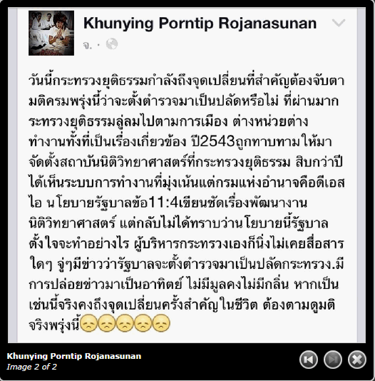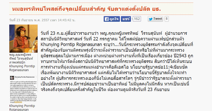 สยามรัฐออนไลน์ 19 กันยายน 2562 ผู้สื่อข่าวรายงานว่า แพทย์หญิงคุณหญิงพรทิพย์ โรจนสุนันท์ สมาชิกวุฒิสภา โพสต์ข้อความในเพจเฟซบุ๊กชื่อ Porntip Rojanasunan ระบุว่า... พระเคยสอนว่าจงเดินในเส้นทา