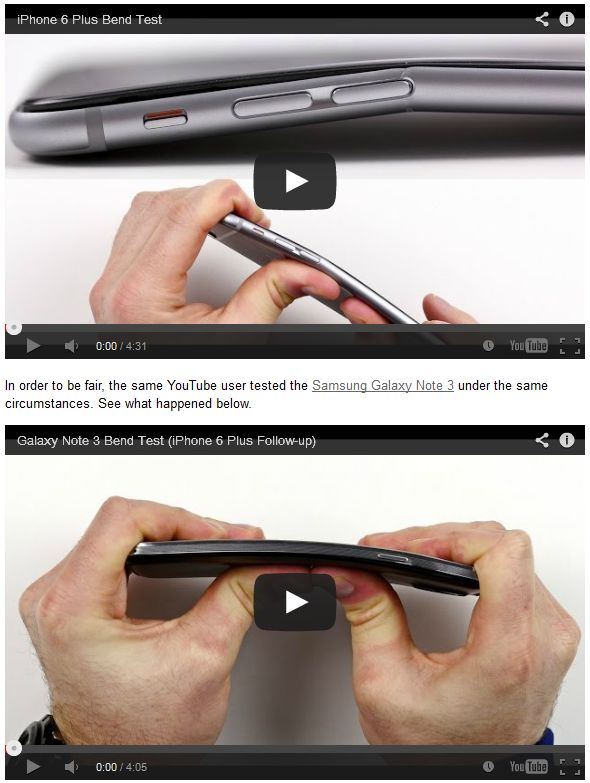 ตอนนี้ผู้ใช้หลายรายพบว่า iPhone 6 Plus มีอาการงอจริง หลังจากที่เอาใส่ไว้ในประเป๋ากางเกงแล้วนั่งทับมันลงไป ซึ่งทางทีมงาน Unboxtherapy เลยลองทำการทดสอบ นำเอา iPhone 6 Plus และ Samsung Galaxy Note 3 มาทำ