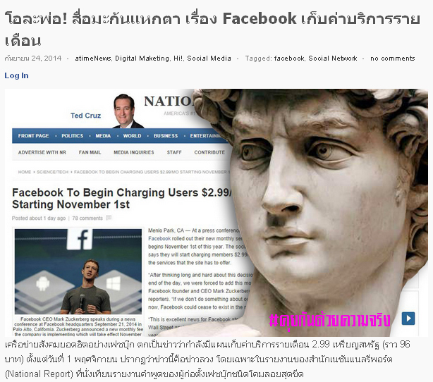 เครือข่ายสังคมยอดฮิตอย่างเฟซบุ๊ก ตกเป็นข่าวว่ากำลังมีแผนเก็บค่าบริการรายเดือน 2.99 เหรียญสหรัฐ (ราว 96 บาท) ตั้งแต่วันที่ 1 พฤศจิกายน ปรากฏว่าข่าวนี้คือข่าวลวง โดยเฉพาะในรายงานของสำนักเนชันแนลรีพอร์ต (National Report) ที่นั่งเทียนรายงานคำพูดของผู้ก่อตั้งเฟซบุ๊กชนิดโคมลอยสุดขีด