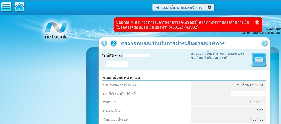 โปรแกรมเปลี่ยนไปใช้ KTB netbank ชำระค่าบัตรไม่ได้ขึ้น Error ตามรูป โทรถาม