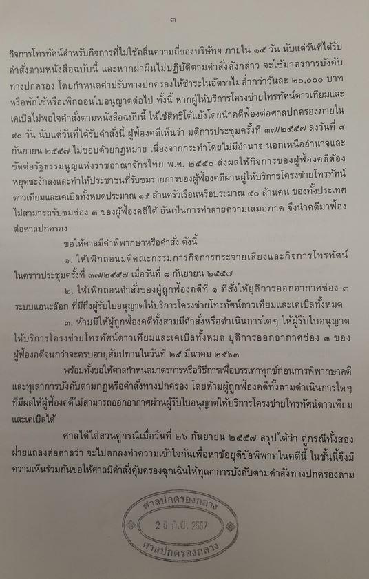 **ขาดหน้า2/4 ภาพจาก @wootthinan ศาลปกครองมีคำสั่งทุเลาการบังคับใช้คำสั่ง กสท. ที่ให้โครงข่ายดาวเทียม-เคเบิลยุติการออกอากาศช่อง 3 อนาล็อก จนถึงวันที่ 11 ตุลาคม 2557 เวลา 16 นาฬิกา 30 นาที หลังจากนี