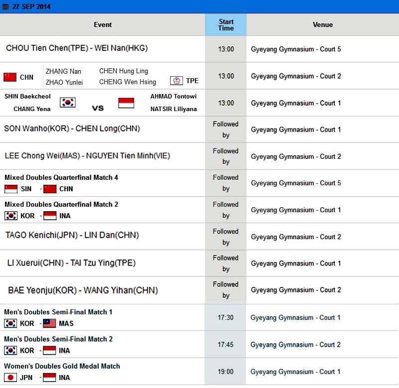 โปรแกรมการแข่งขัน Badminton Asian Games Incheon 2014 : 28 ก.ย. 2557 (คู่แรก เริ่มแข่งเวลา 11.00 น.)