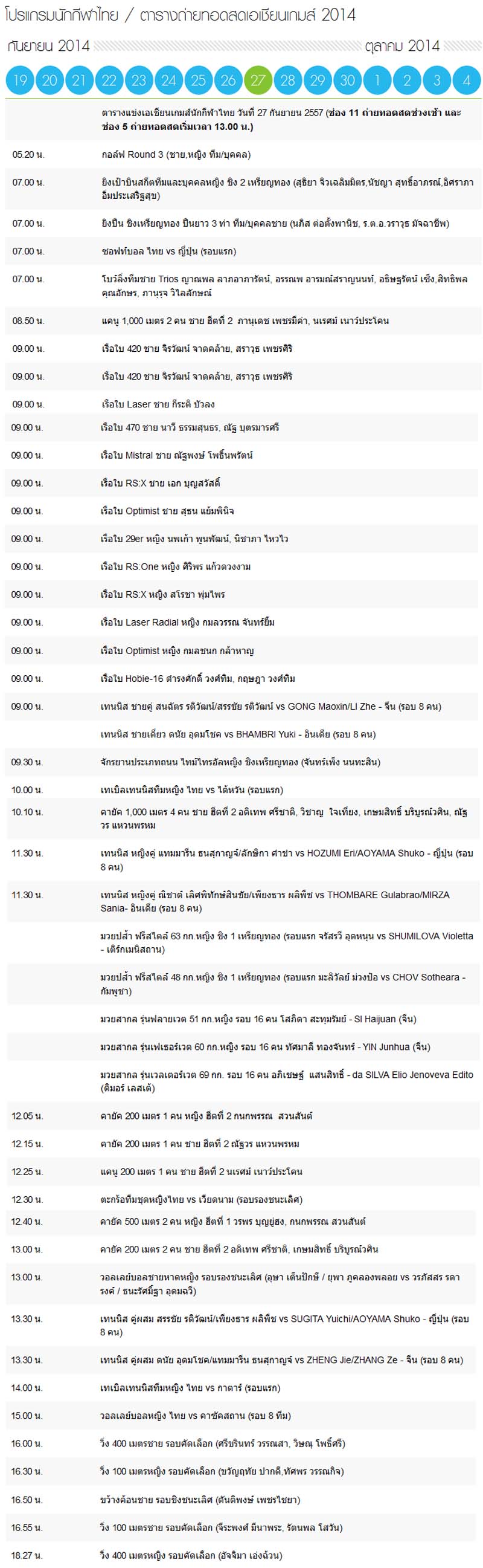 โปรแกรมแข่งขันของนักกีฬาไทยในเอเชี่ยนเกมส์ 27 ก.ย. 2557