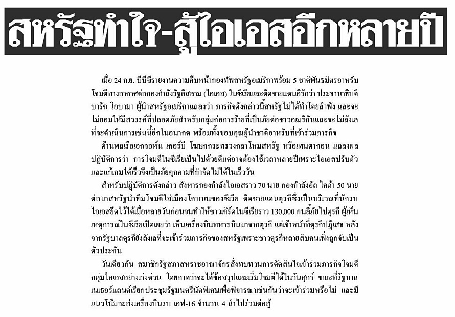 อย่างไรก็ตาม ในความเห็นของโอบามาแล้ว สงครามที่กำลังขยายตัวเพื่อถอนรากถอนโคนไอเอส เป็นเพียงหนึ่งในวิกฤตการณ์ที่ทั่วโลกกำลังเผชิญอยู่