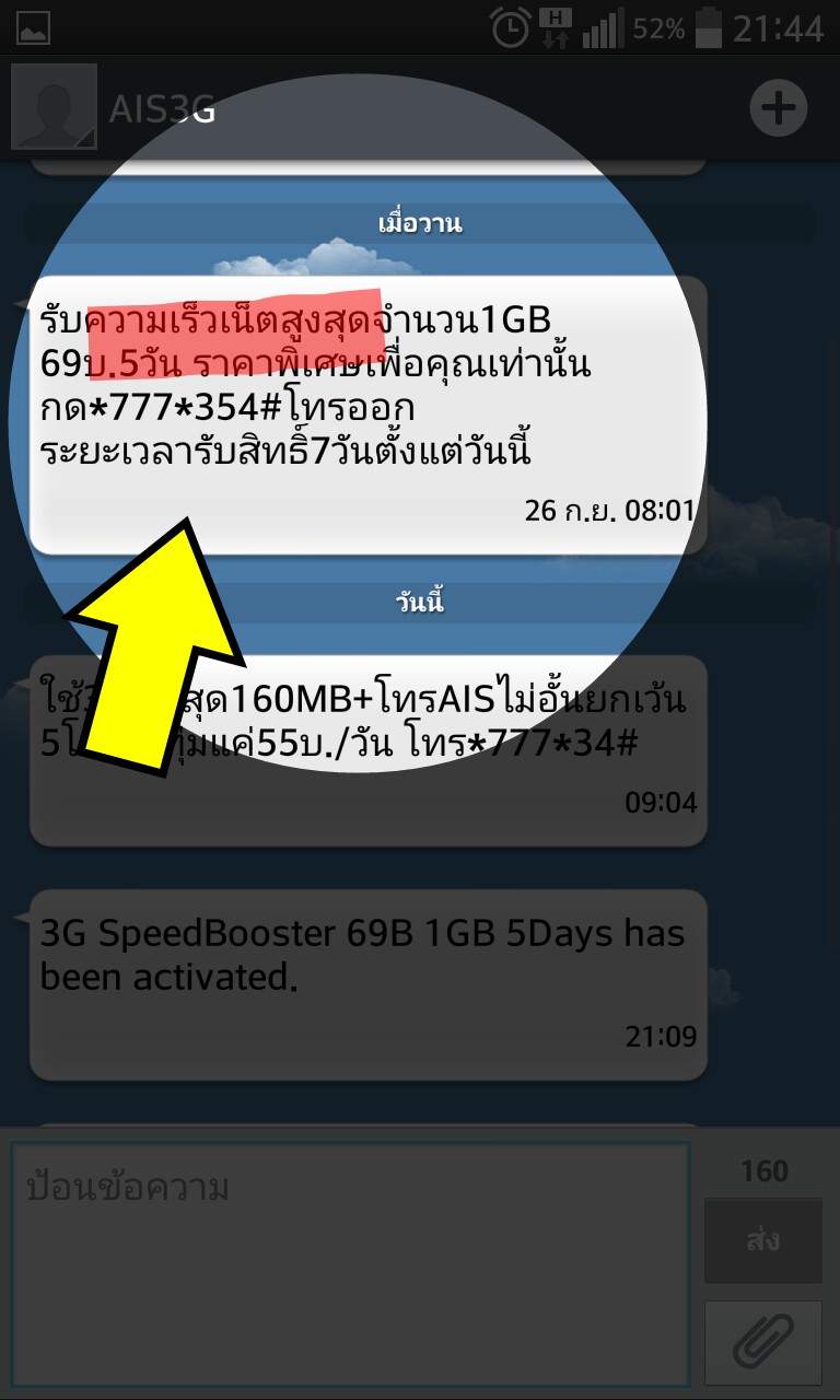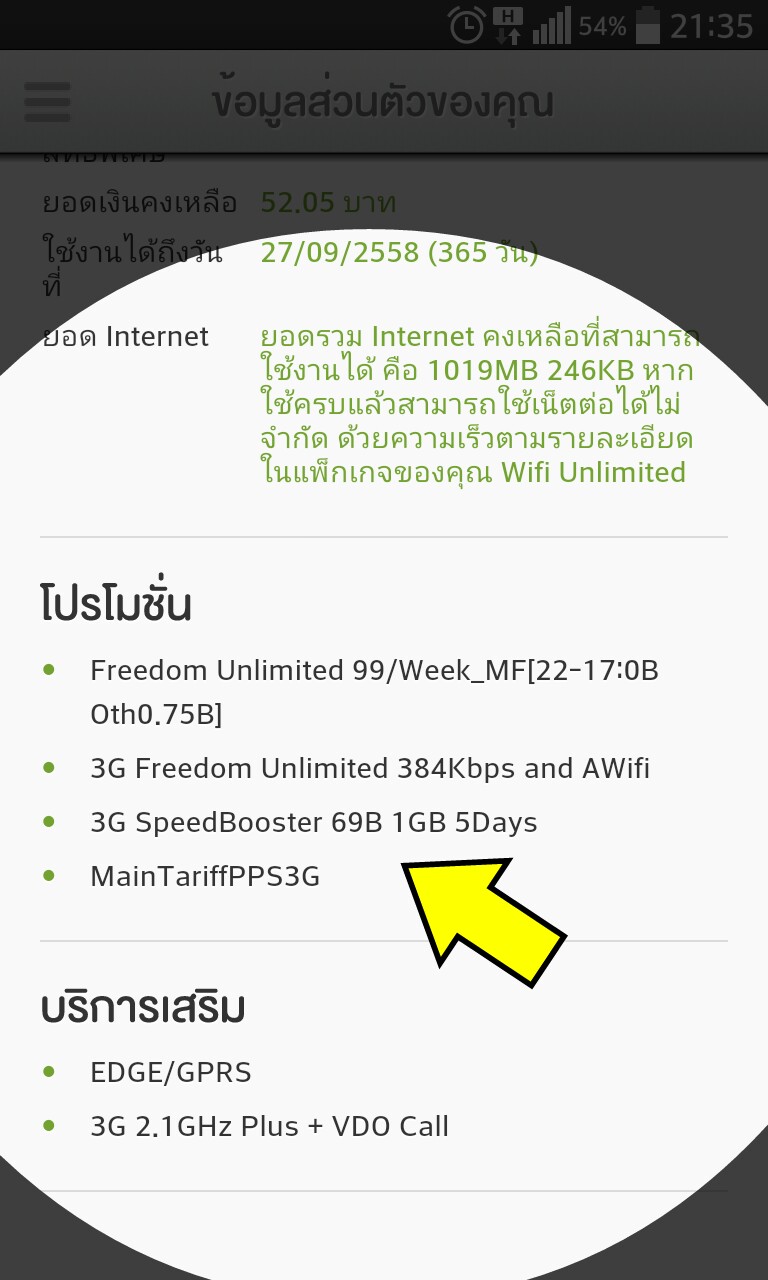 ผมใช้ โปร Freedom Unlimited เป็นโปรโมชั่นหลัก แต่เนื่องจากวันนี้ มีความจำเป็นต้องใช้ความเร็วที่สูงกว่านี้ แต่ก็มี 1 ทางเลือกที่คุ้มค่า เนื่องจาก มีข้อความแนะนำโปรโมชั่นเสริม 69 บ. 1GB ใช้งานได้ 5 วัน เพราะมีข้อความส่งมาแนะนำแทบทุกสัปดาห์