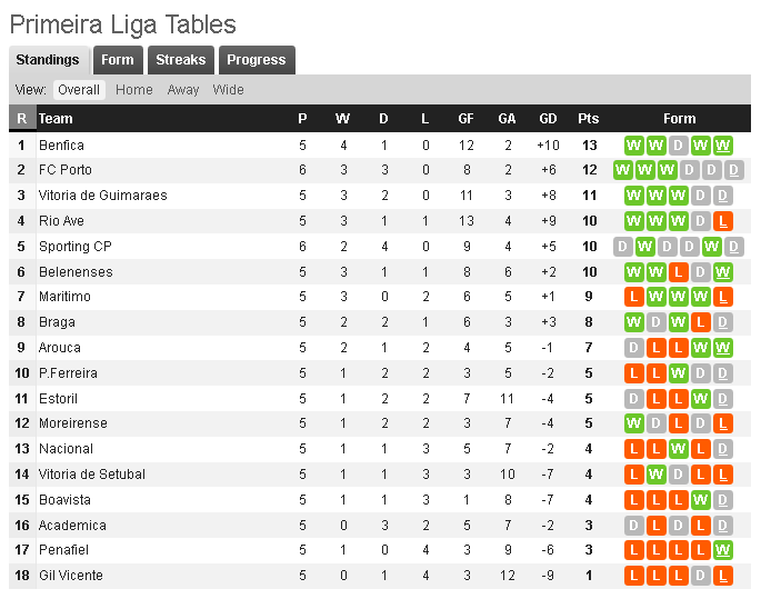 ขณะที่ปอร์โต้ยังคงรั้งอันดับ 2 มี 12 แต้มแข่งน้อยกว่า เบนฟิก้า 1 นัดขณะที่เบนิฟ้ามีอยู่ 13 แต้ม