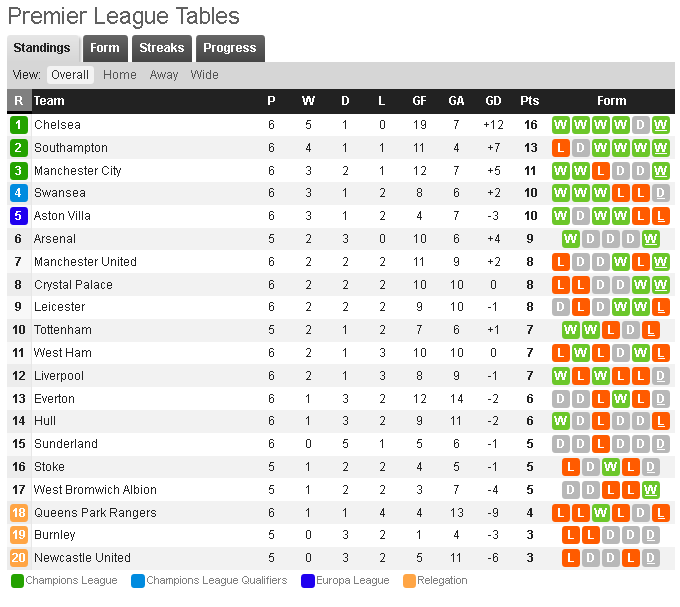 ขณะที่เอฟเวอร์ตัน อาการหนักพอกัน แม้จะยิงได้เยอะกว่า แต่ก็เสียประตูมากกว่าอยู่ดี แข่ง 6 นัดพวกเขาถึ่งชนะเพียง 1 นัดเท่านั้นตกไปอยู่อันดับ 13 ตามหลังลิเวอร์พูลอยู่ 1 แต้มด้วยผลต่างประตู -2
