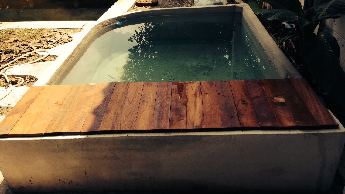 เมื่องานคอนกรีตของบ่อเสร็จ ก็เริ่มวัดขนาดหาไม้ระแนงโดยผมเลือกไม้แดงแทนที่จะเป็นไม้เทียมเหมือนที่หลายๆคนใช้กัน
