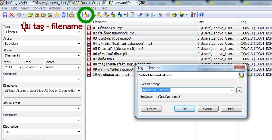 แล้วเลือก format string เป็นชื่อเพลง ตามด้วยชื่อศิลปิน หรือชื่อศิลปิน ตามด้วยชื่อเพลง มันก็จะแก้ให้เองทั้งหมด