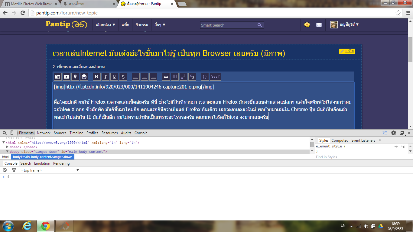 คือโดยปกติ ผมใช้ Firefox เวลาจะเล่นเน็ตอ่ะครับ ทีนี้ ช่วงไม่กี่วันที่ผ่านมา เวลาผมเล่น Firefox มันจะขึ้นแถบด้านล่างแปลกๆ แล้วก็จะพิมพ์ไม่ได้จนกว่าผมจะไปกด X ออก ซึ่งสักพัก มันก็ขึ้นมาใหม่อีก ตอนแรกก็นึกว่าเป็นแค่ Firefox อันเดียว เลยจะลบละลงใหม่ พอย้ายมาเล่นใน Chrome ปุ๊บ มันก็เป็นอีกแล้ว พอเข้าไปเล่นใน IE มันก็เป็นอีก ผมไม่ทราบว่ามันเป็นเพราะอะไรหรอครับ สแกนหาไวรัสก็ไม่เจอ งงมากเลยครับ