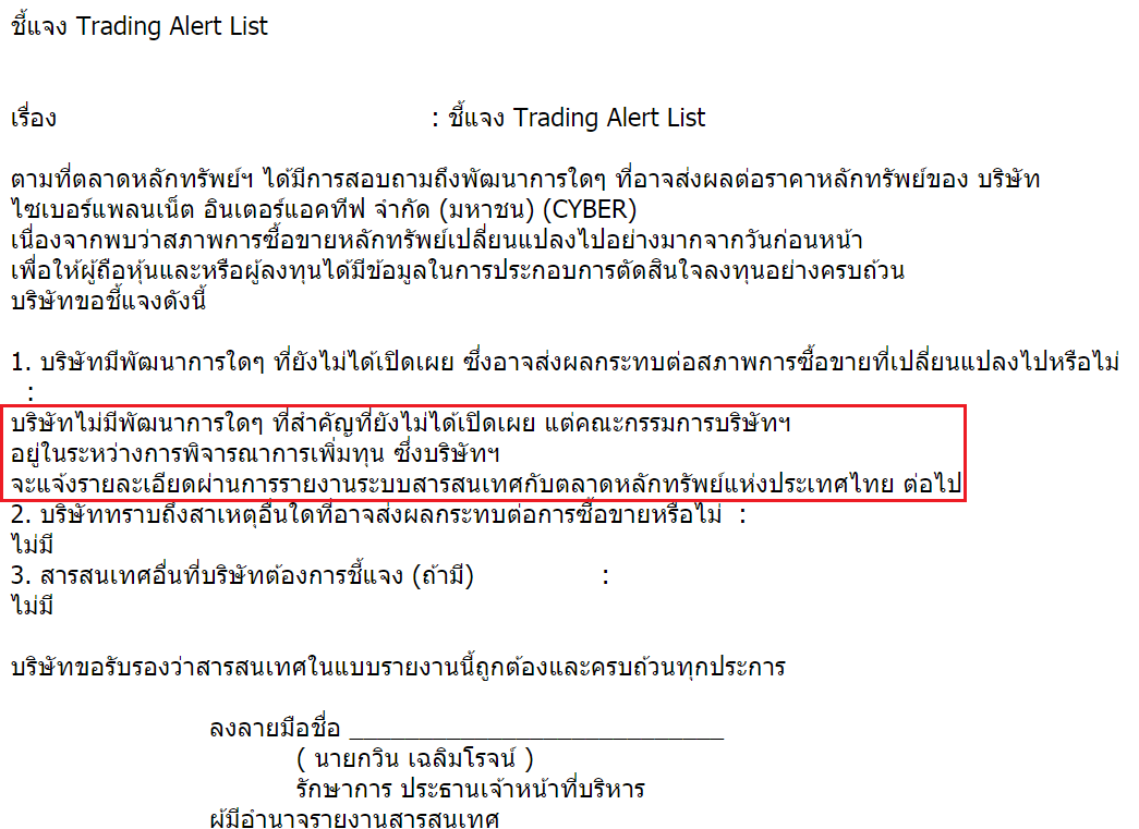http://www.set.or.th/set/newsdetails.do?headline=%AA%D5%E9%E1%A8%A7+Trading+Alert+List&time=1411950422000&source=CYBER&symbol=CYBER&pdf=dat%2Fmds_news%2Fnews%2F1026NWS290920140727030533T.pdf&filename=dat%2Fmds_news%2Fnews%2F1026NWS290920140727030533T.txt&type=R&language=th&country=TH