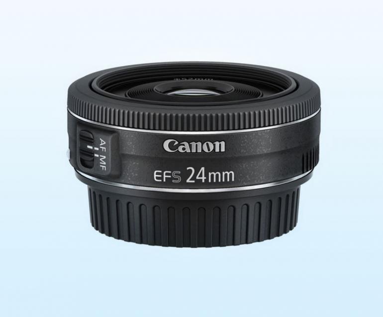 ส่วน เลนส์แพนเค้ก EF-S24mm f/2.8 STM เป็นเลนส์ที่ออกแบบให้ ที่มีน้ำหนักเบาและบางที่สุดในบรรดาเลนส์ตระกูล EF-S ทั้งหมดที่ใช้สำหรับกล้องเซ็นเซอร์ขนาด APS-C มีขนาดเล็กกว่าเลนส์คิททั่วไปค่อนข้างมาก เพราะหนาเพียง 22.8 มม. และหนัก 125 กรัม (ประมาณ 1 ใน 3 ของเลนส์คิท) มีขนาดทางยาวโฟกัส 24 มม. เหมาะสำหรับการถ่ายภาพในสถานการณ์ทั่วไป มีรูรับแสงกว้าง f/2.8 ช่วยให้การละลายฉากหลังให้เบลอ ประกอบขึ้นจากชิ้น เลนส์พิเศษแบบ GMo (glass-molded) Aspherical ด้วยเทคโนโลยี Stepping Motor (STM) จึงโฟกัสได้เงียบและนิ่ง เหมาะสำหรับถ่ายวิดีโอเพราะปราศจากเสียงรบกวน