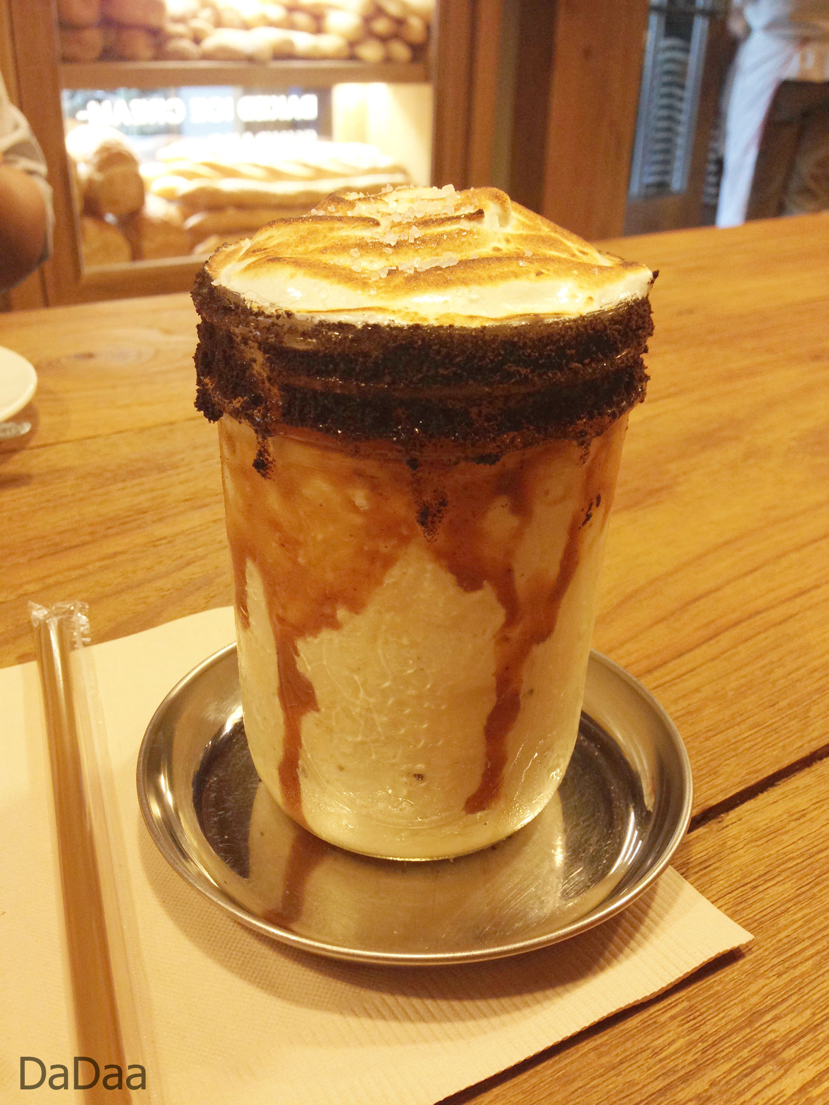 ครีมสีขาวด้านบนก็คล้ายกับแก้วแรก ขอบแก้วคล้ายกับช็อกโกแล็ต (น่าจะเป็นผงโกโก้แล้วใช้ไฟลนให้ละลาย)