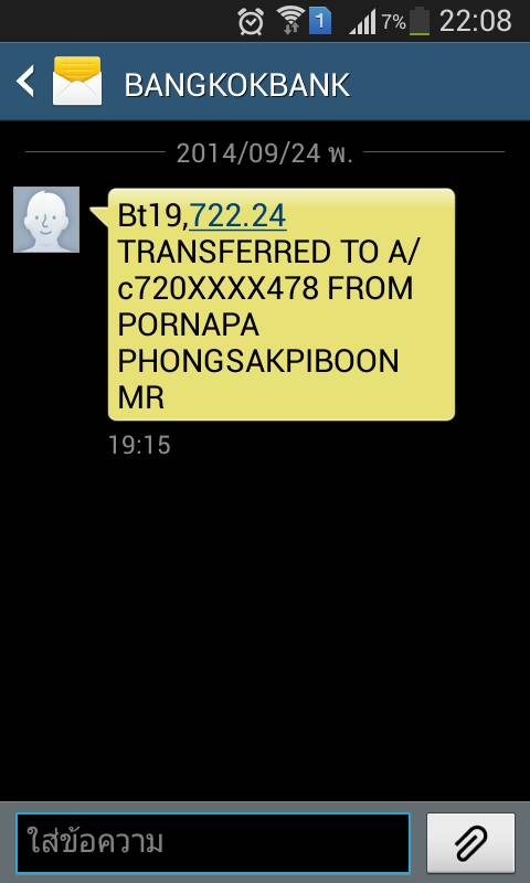 เมื่อวันที่ 24 กันยา ที่ผ่านมาแฟนได้รับ message จาก ธนาคารกรุงเทพ แจ้งว่ามียอดเงินโอนเข้ามา จำนวน 19,722.24