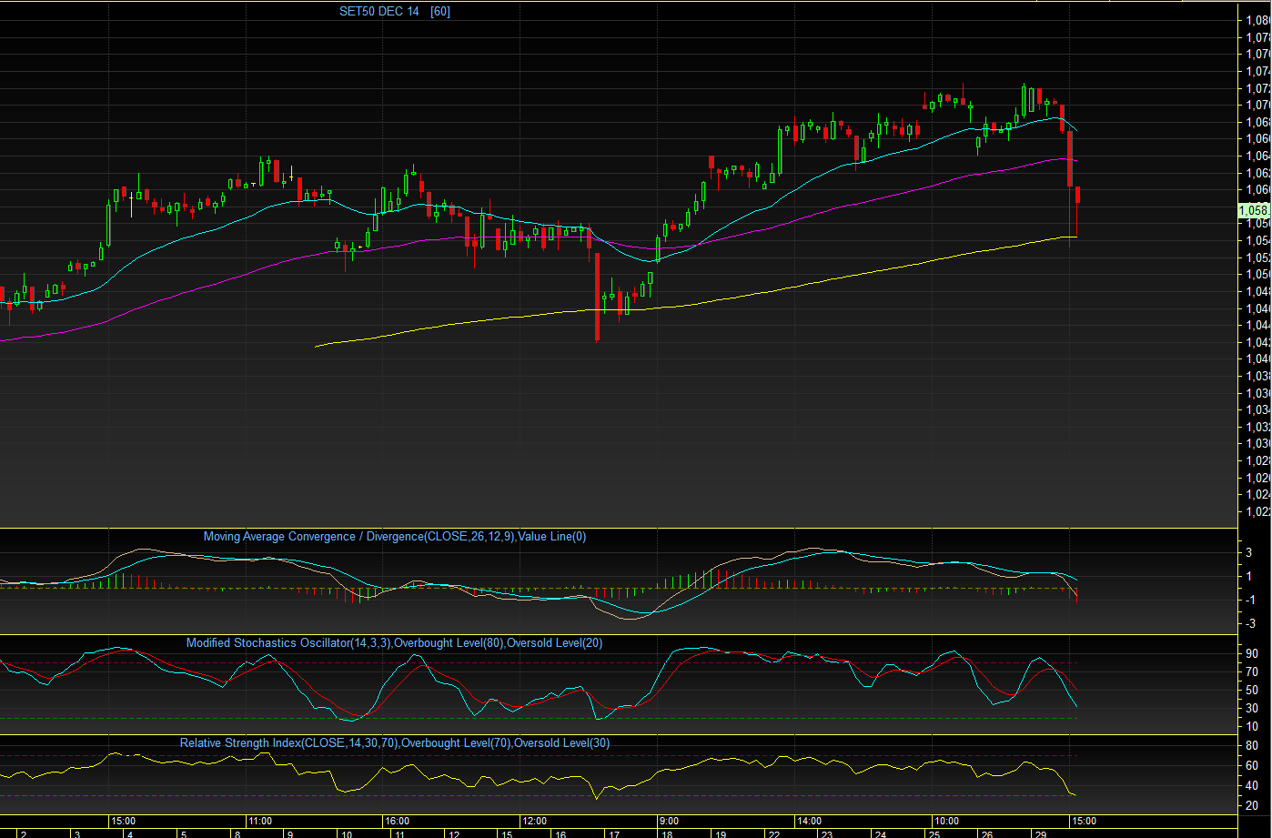 ร่วงลงมาอย่างรุนแรง โดยเฉพาะช่วงบ่าย ไหลมาถึง -20 จุด แต่ช่วงท้ายตลาดได้มีแรงซื้อกลับเข้ามา ดันให้ดัชนี SET Index