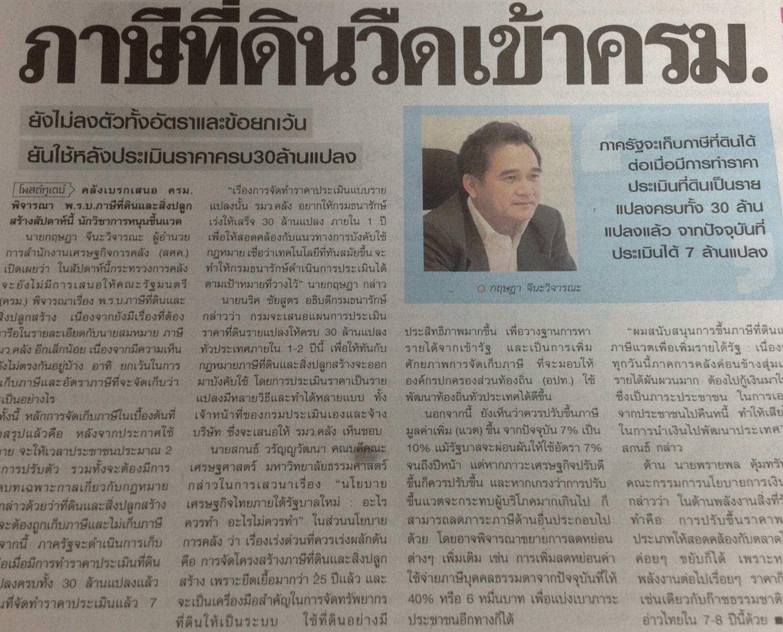 เรื่องภาษีที่ดิน ไม่ได้ผ่านกันง่ายๆ เท่าที่อ่านข่าวมา มันไม่ได้ช่วยคนจน ลดช่องว่างทางสังคมเลยซักนิด ถ้าจะลดช่องว่างทางสังคม และช่วยเหลือคนจน ควรจะออกกฎหมายอย่างนี้
