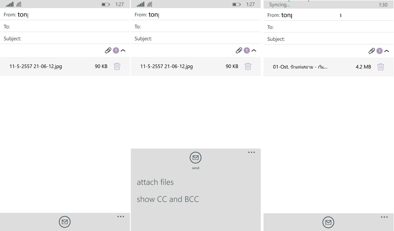 - รองรับการแนบไฟล์เอกสารได้จากในอีเมลเลย (จากเดิมที่แอพอีเมลในเครื่องจะแนบได้เฉพาะภาพถ่ายเท่านั้น หากจะแนบไฟล์เอกสารต้องแนบผ่านแอพ office) รวมถึงสามารถแนบไฟล์รูปภาพ รวมถึงไฟล์เพลงและไฟล์อื่นๆที่เก็บอยู่ในเครื่องได้ (จะอยู่ที่หน่วยความจำเครื่องหรือบน SD Card ก็ได้ ด้วยความสามารถของ file picker บน Windows phone 8.1)