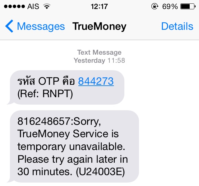 ***รอบแรกได้ข้อความนี้มาแสดงว่าเติมไม่ได้ ให้ลองใหม่อีกครั้ง*** แสดงว่าเติมเงินเข้า True Money ไม่สำเร็จ