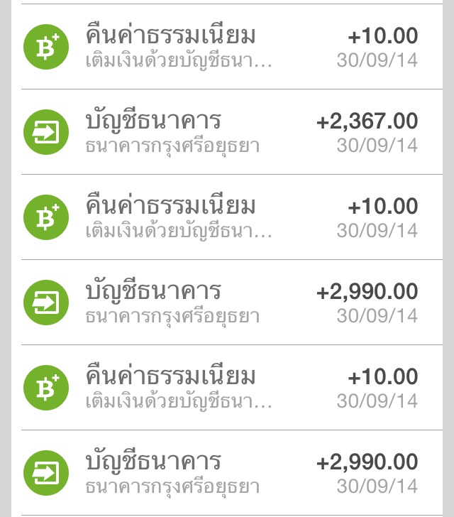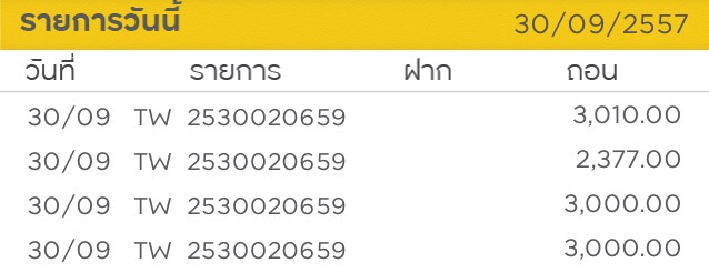 รอบที่ 1 วันที่ 30/09/2557 ผมเติม 3,000 บาท + ค่าธรรมเนียม 10 จะได้ยอดรวม 3,010 บาท