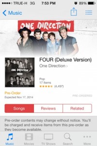 ผมพรีออร์เดอร์อัลบั้มของ One Direction ใน iTunes ราคา 14.99$ ณ ตอนนั้นเพลงยังไม่ถูกปล่อยแม้แต่เพลงเดียว และเงินยังไม่ถูกหัก วันนี้ผมเข้า iTunes จึงเห็นว่ามีเพลงปล่อยมา 1 เพลง และเงินถูกหัก 1.29$ ผมสงสัยน่ะครับว่า ปกติแล้วเงินจะถูกหักครั้งเดียว 14.99$ เลย หรือว่าถูกหักไปเรื่อยๆตาม track ที่ถูกปล่อยออกมาครับ แล้วถ้าหักตาม track ที่ปล่อยออกมา ในรายละเอียดของอัลบั้มมีทั้งหมด 16 track จะเสียเงิน 1.29 x 16 = 20.64$ หรือว่า 14.99$ ตามราคาที่พรีออร์เดอร์ครับ
