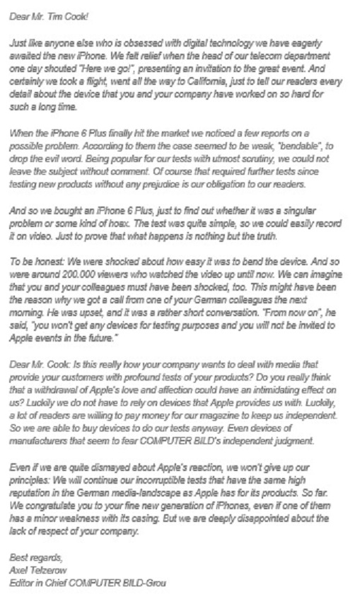 บรรนาธิการถึงกับต้องออกจดหมายเปิดผนึกถึงเจ๊ทิม ประมาณว่า สื่อของเค้าก็รอ product ของ apple อย่างใจจดใจจ่อเหมือนคนอื่น ๆ และเสนอข่าว product คุณอย่างใกล้ชิด และเมื่อไอโฟนวางขายจริง ก็มีรายงานว่าเครื่องมันงอได้ ด้วยความเป็นสื่อที่มีหน้าที่รับผิดชอบต่อผู้อ่านของเค้า เค้าจะละเลยโดยไม่ได้ทดสอบปัญหานี้ และไม่มีความเห็นใด ๆ เลยไม่ได้ จึงได้ซื้อไอโฟน 6+ มาทดสอบ ผลเป็นที่น่าตกใจเพราะว่าสินค้าคุณงอได้ง่ายมาก ๆ คุณเองก็คงตกใจไม่น้อยอยู่เหมือนกัน แต่เมื่อเช้าเราได้รับโทรศัพท์จาก apple ว่าสื่อนี้จะไม่ได้รับอุปกรณ์ใด ๆ จาก apple ไปใช้ review อีกต่อไป และจะถูกแบนจากกิจกรรมทุกชนิดที่จัดโดย apple นี่เป็นวิธีการที่คุณใช้กับสื่อ ที่มีความบริสุทธ์ใจที่จะนำเสนอข้อมูลต่อผู้อ่านอย่างนั้นหรือ การทำของคุณอย่างนี้คิดหรอว่าเราจะกลัว เราไม่เคยได้รับการ support อะไรจาก apple และเราใช้เงินของลูกค้าที่ซื้อสื่อเรา ไปซื้ออุปกรณ์ของคุณมาทดสอบได้อย่างอิสระเสรี บลาๆๆๆๆ
