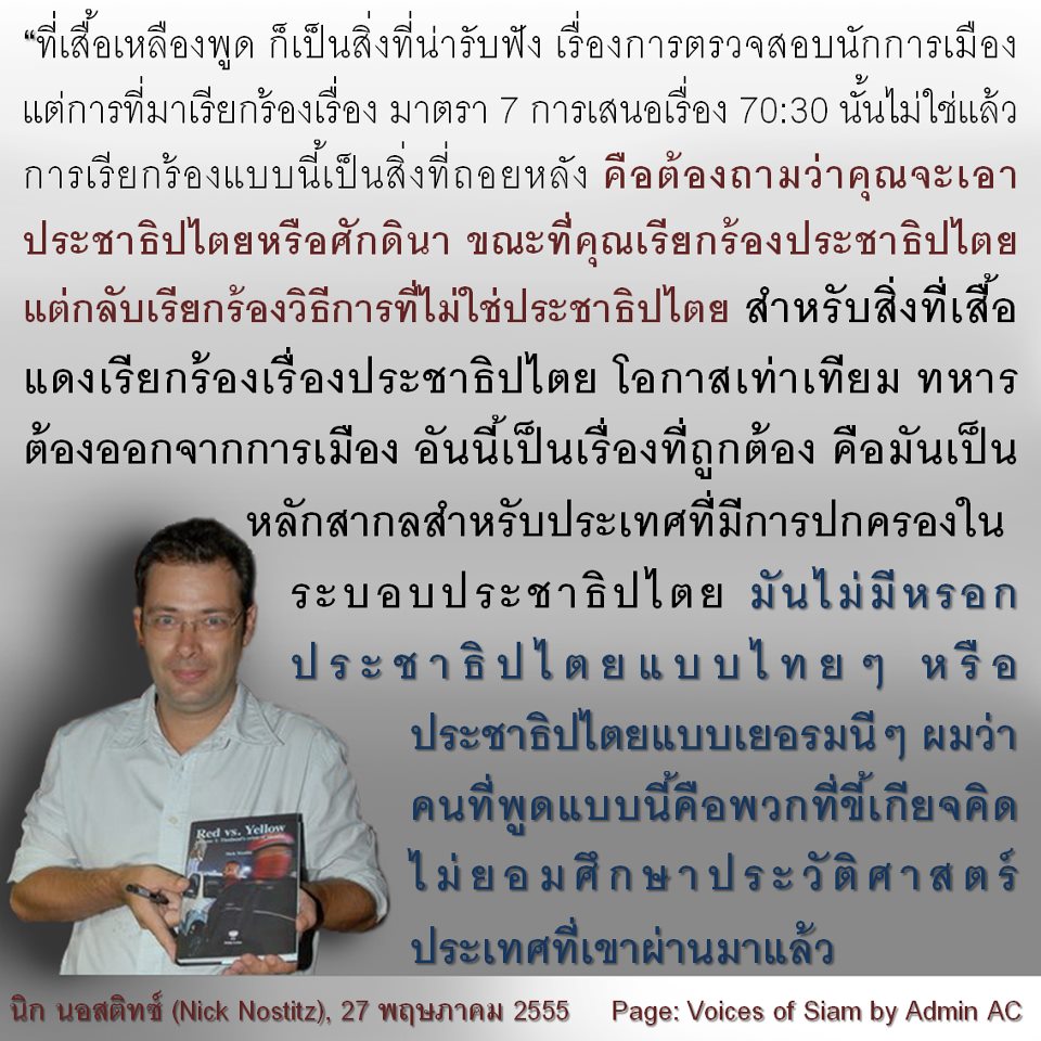 ผมไม่ได้แดง ไม่ได้คลั่งอดีต นายกทักษิณ ฯ แต่เห็นการกระทำที่มัน 2 มาตรฐาน มันก็เลยเห็นใจฝ่ายเสื้อแดง...ผมได้เอาข้อความของนายนิกส์ ฯ มาแปะ เผื่อบางท่านไม่ได้อ่าน..เชิญครับ