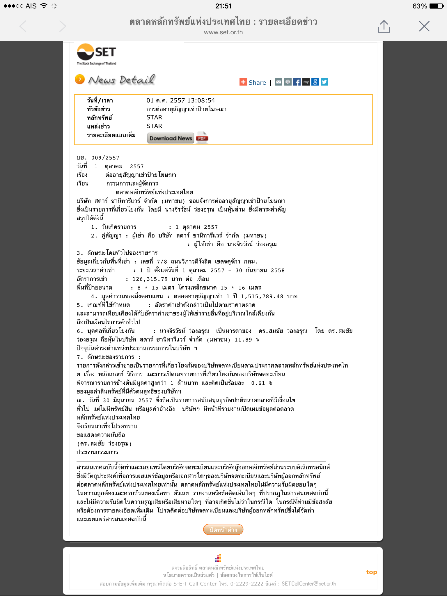 บริษัท star เช่าป้ายโฆษณาจากบุคคลที่เกี่ยวโยงกัน คือ นางจิรวัธน์ ว่องอรุณ เป็นมารดาของ ดร.สมชัย ว่องอรุณ โดย ดร.สมชัย ว่องอรุณ ถือหุ้นในบริษัท สตาร์ ซานิทารีแวร์ จำกัด (มหาชน) 11.89%