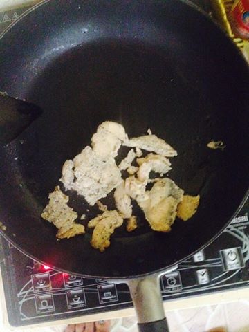 ขั้นที่สองคือ นำไก่ย่างค่ะไปอุ่นในกระทะ ใส่น้ำมันเล็กน้อยค่ะ พออุ่นๆก้อพาไปพักไว้ขอบกระทะค่ะ