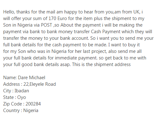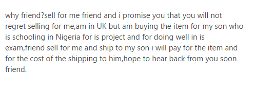 แล้วก็มีคนๆนึงอ้างว่าทำงานอยู่อังกฤษ ต้องการซื้อมือถือของผม ส่งไปให้ลูกที่ไนจีเรีย(ดูไม่สมเหตุสมผลเลย)