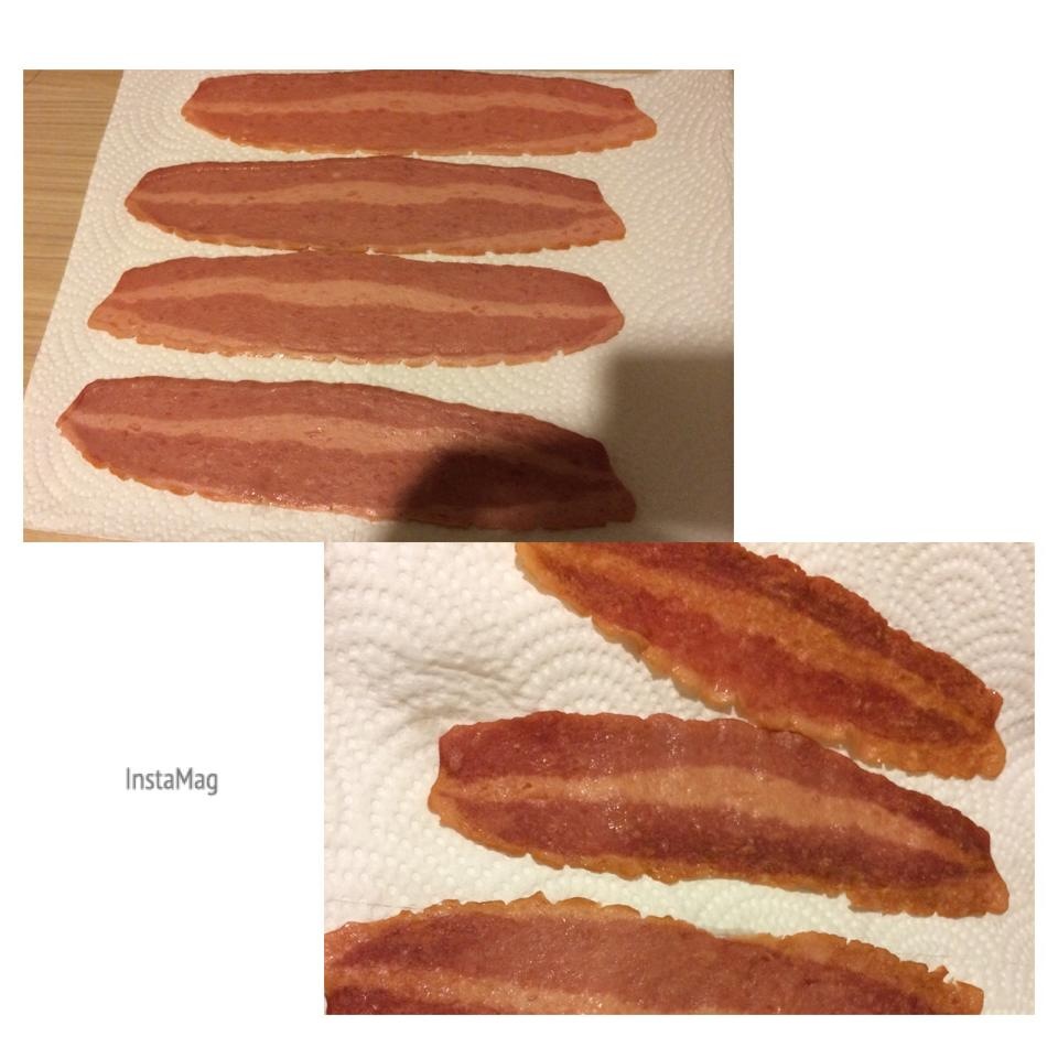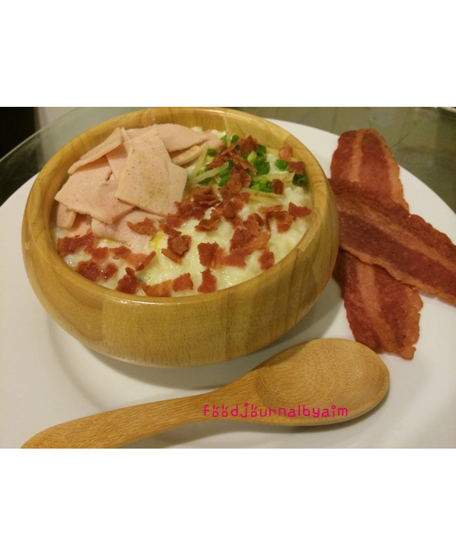 ใช้ไข่ขาวขวดของ cp สัดส่วนเท่ากันกับน้ำร้อนคนๆๆ เวฟ 3 นาที เอาออกมาเป็นโจ๊กเลย เราโป๊ะแฮมอกไก่ กับเบค่อนย่างลงไป
