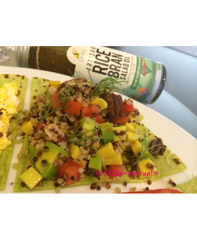 และอโวคาโด้ คีนวา มะเขือเทศ วางบนแผ่น ตอร์ทีญ่า