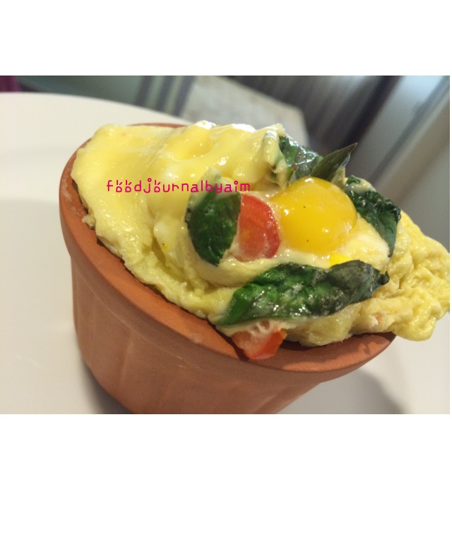 ไข่อบ ไข่เต็มใบ 2 แยกไข่แดงออกมา 1 ตีๆๆที่เหลือให้นวล ใส่มะเขือเทศ โหระพา เวฟ 2นาที แล้วเอาไข่แดงที่แยกออกมาโปะลง เราปรุงด้วยซีอิ้วโลว์โซเดียม