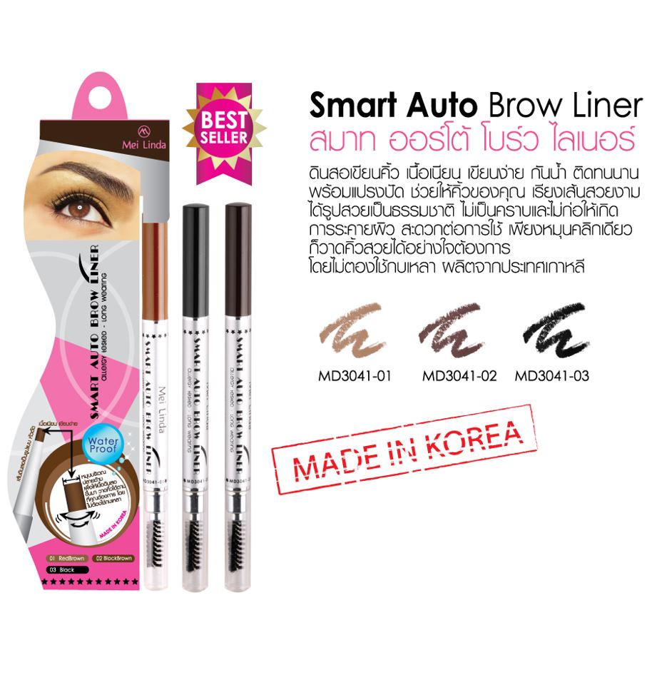 4.ดินสอเขียนคิ้วคะ MEI LINDA รุ่นนี้ ไม่ต้องเหลา เป็นดินสอแบบหมุนค่ะ มี5สี สีดำ,น้ำตาลอ่อน,น้ำตาลเข้ม,วอลนัทและชอคโกมิลค์ค่ะ ราคาแท่งละ 80 บาทค่ะ
