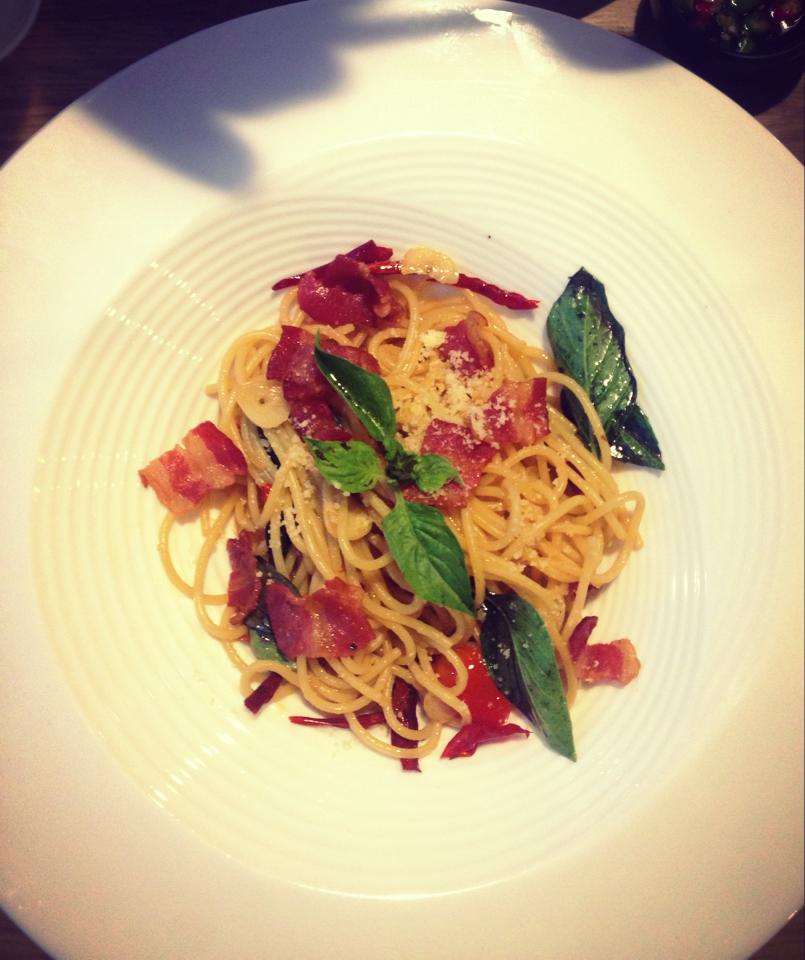 จากรูป เมนูที่สั่งคือ สปาเก็ตตี้ผัดพริกแห้ง กระเทียม เบคอน