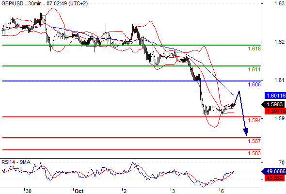 Our preference: Short positions below 1.606 with targets @ 1.594 & 1.587 in extension.