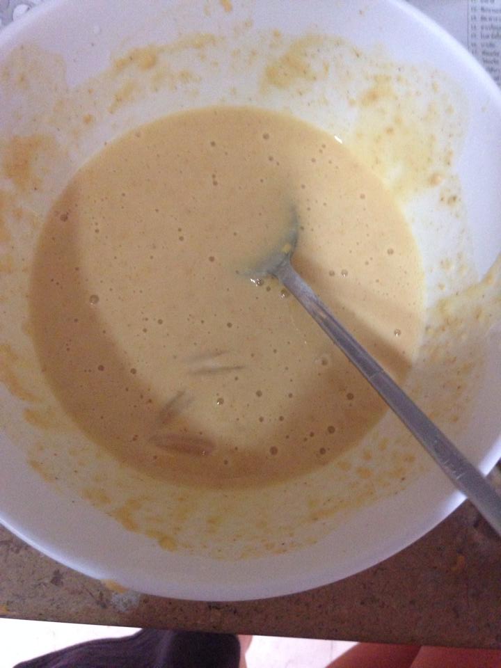 ทีนี้แป้งมันเหลือ ไข่ก็เหลือ เราเลยเอามาผสมกัน แล้วโกกิเนี่ย เขาบอกผสมน้ำเย็นทอดแล้วจะกรอบ ด้วยความฮาร์ดคอร์เลยเอาน้ำแข็งมาใส่เลย555
