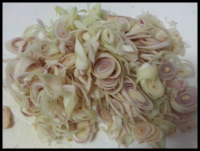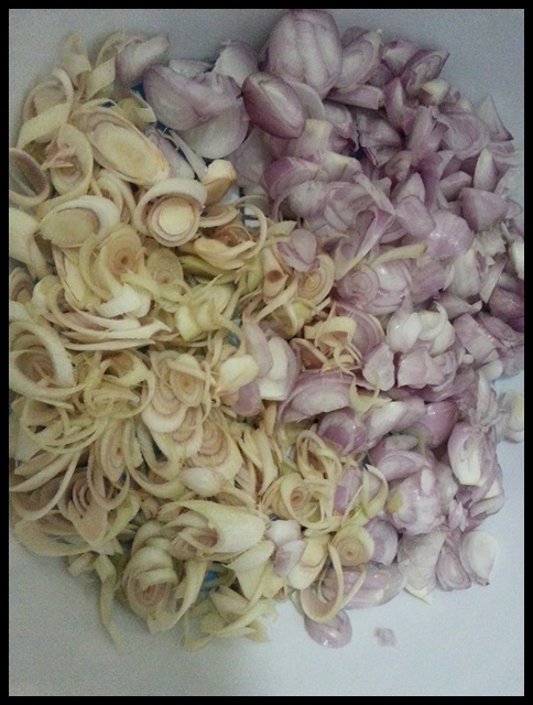 เริ่ม จัดการ หั่นๆ ซอยๆ ตะไคร้ - ใบมะกรูด - หอมแดงไทย - พริกชี้ฟ้า ค่ะ
