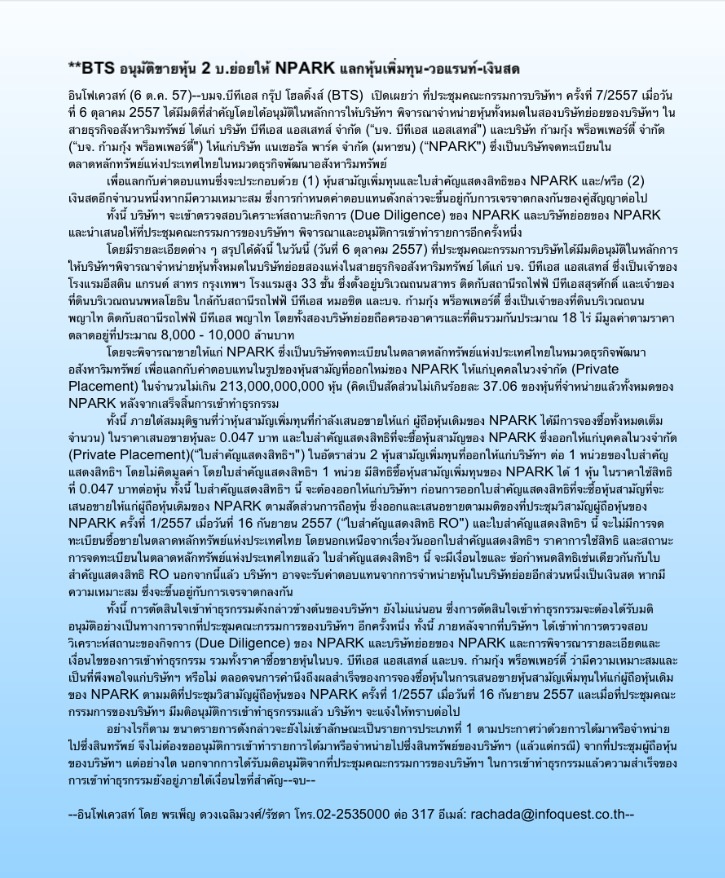 . BTSจะกลายเป็นผู้ถือหุ้นใหญ่NParkไหม