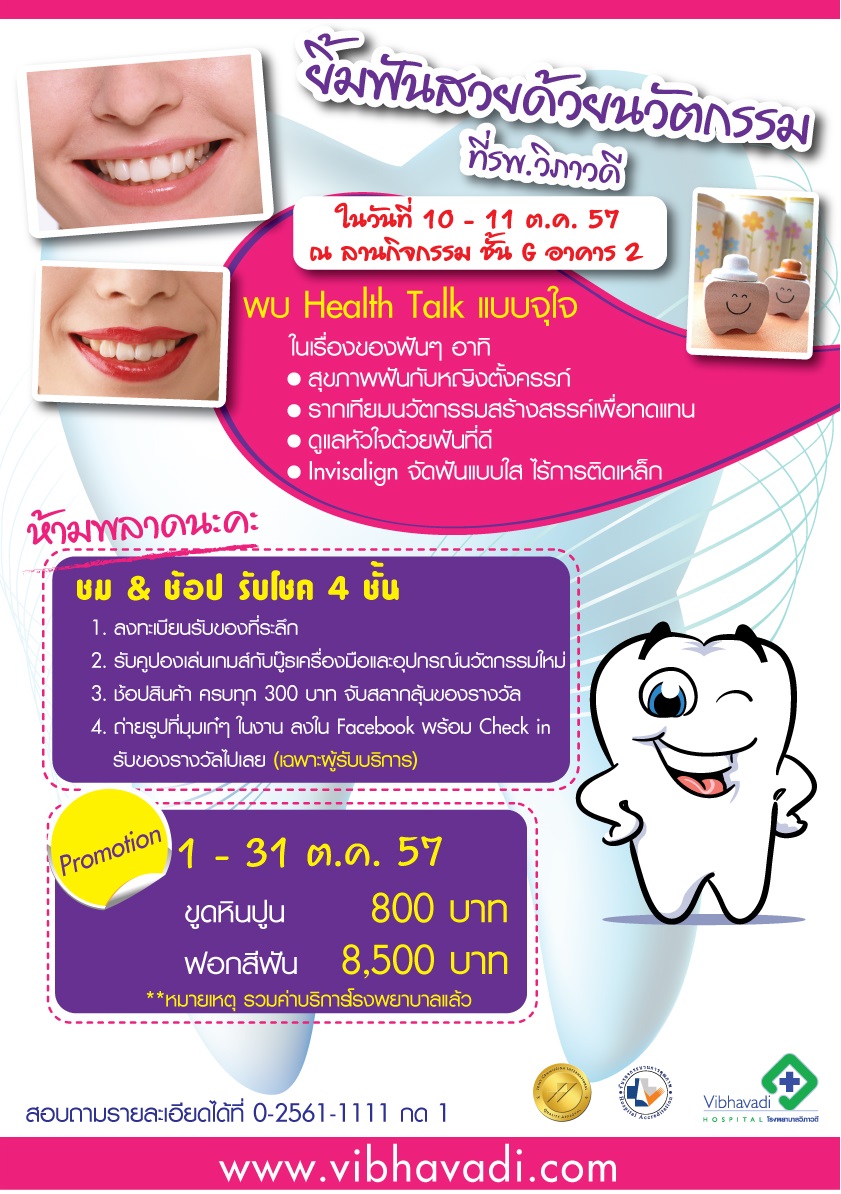 รพ.วิภาวดี ขอเชิญร่วมงาน "ยิ้มฟันสวย ด้วยนวัตกรรม" เนื่องในวันทันตสาธารณสุข พบกับการเสวนา Health Talk โดยทันตแพทย์ อาทิ สุขภาพฟันกับหญิงตั้งครรภ์ , รากเทียมนวัตกรรมสร้างสรรค์เพื่อทดแทน, ดูแลหัวใจด้วยฟันที่ดี, Invisalign จัดฟันแบบใส ไร้การติดเหล็ก และซื้อผลิตภัณฑ์เพื่อสุขภาพฟัน พร้อมรับของที่ระลึกมากมาย กิจกรรมจัดในวันที่ 10-11 ต.ค. 57 ตั้งแต่เวลา 09.00-15.00 น. ณ ลานกิจกรรม ชั้น G อาคาร 2 รพ. วิภาวดี