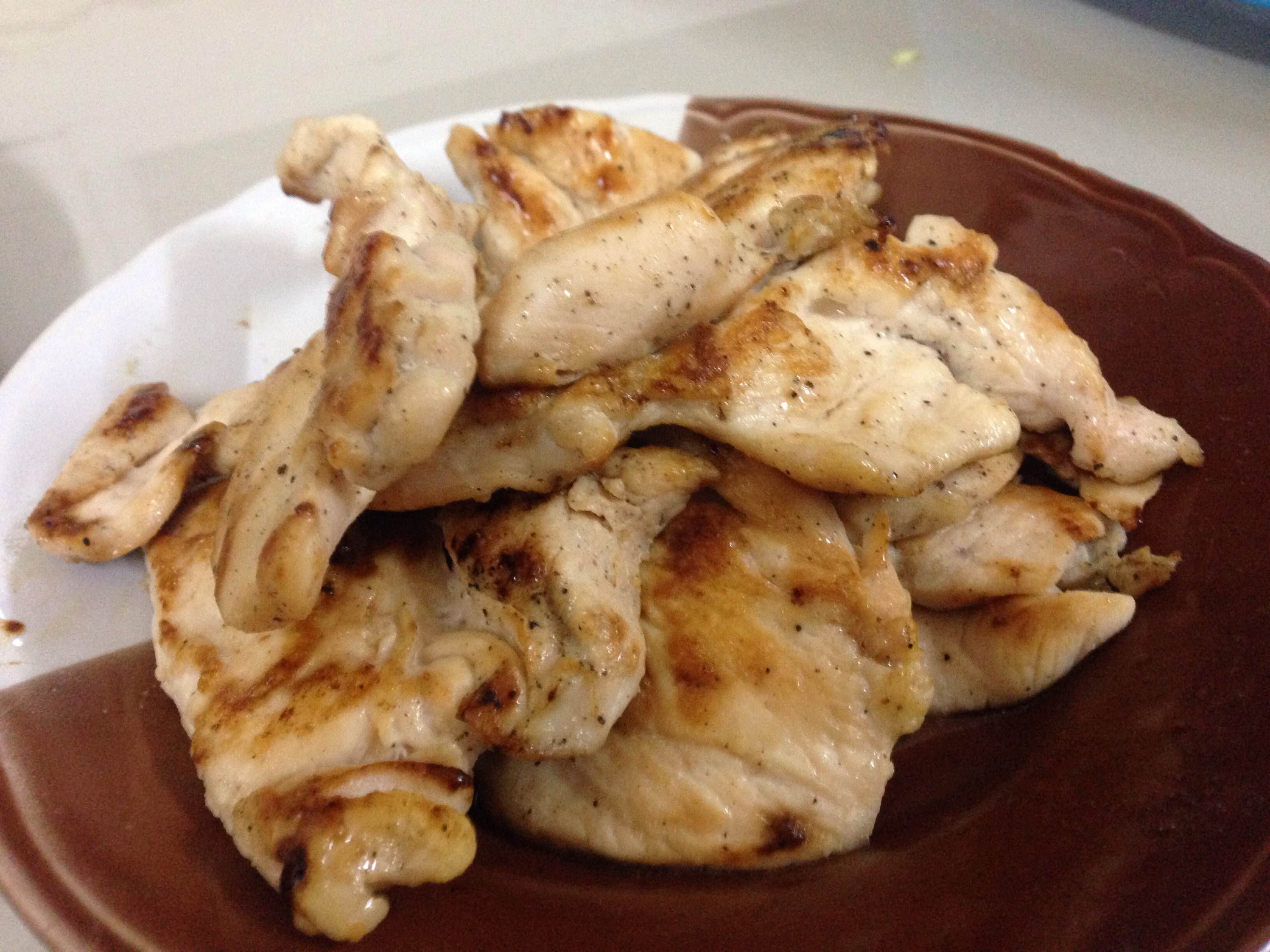 อกไก่แล่บางๆพอประมาณย่างด้วยซีอิ๊วขาวกะพริกไทยนิดหน่อย