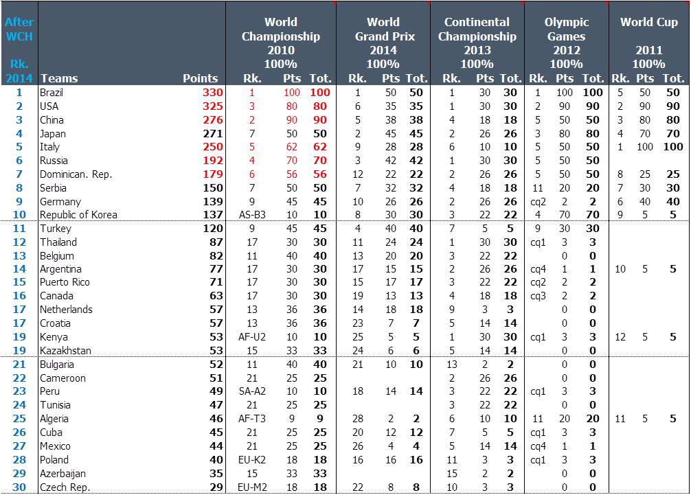 1. บราซิล 100 แต้ม (ครั้งก่อนได้ที่ 2 ได้ 90 แต้ม) คะแนนสะสมหลังจบรายการนี้ = 320-90+100 = 330